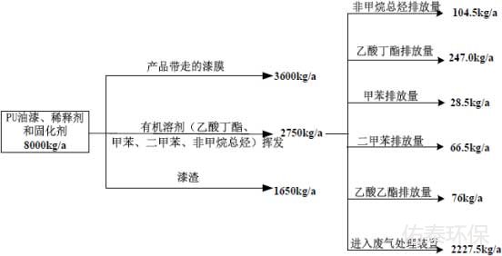 達(dá)產(chǎn)情況下PU油漆年用量為5t、稀釋劑年用量為1t、固化劑年用量為2t,按含量計(jì)算易揮發(fā)物質(zhì)非甲烷總烴0.550t/a、乙酸丁酯1.30t/a、甲苯0.150t/a、二甲苯0.350t/a、乙酸乙酯0.40t/a,其他為樹脂等固化劑。根據(jù)噴油漆涂料用量核算表(表2-4),噴漆進(jìn)入產(chǎn)品的量為3.600t/a。PU油漆、稀釋劑和固化劑物料平衡情況見(jiàn)圖2-1。
