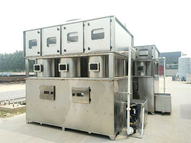 一級旋流板塔)然后再進入干式過濾器,在室中以緩慢速度通過,接觸時間為1.0秒以上,去除廢氣