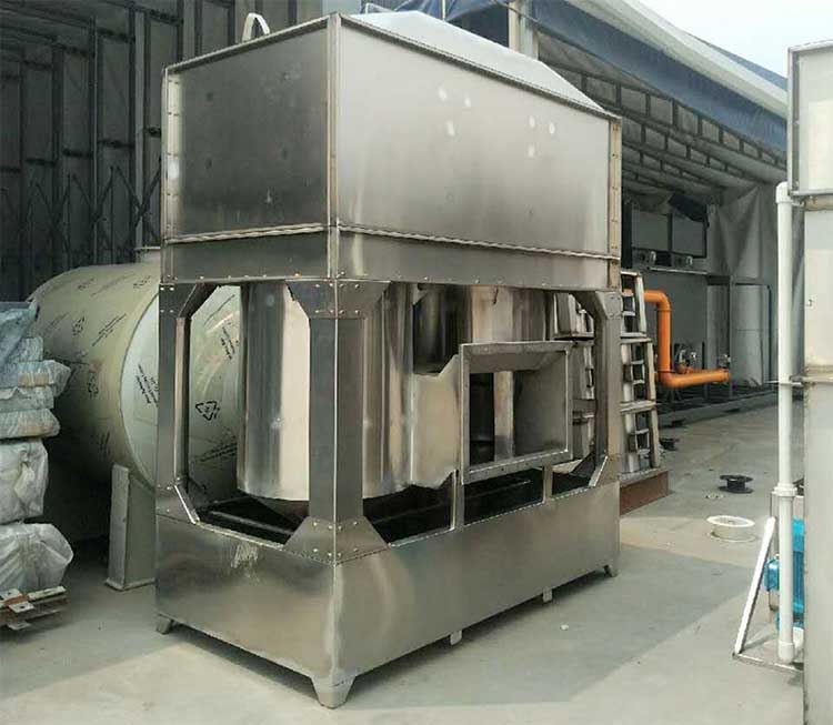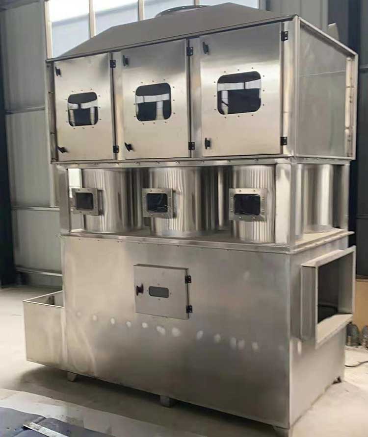 2、旋流板除塵塔內(nèi)安裝有多個“圓形旋流桶”和高效除霧板。旋流桶內(nèi)放有實心填料球,用來凈化粉塵或粘性廢氣,***上層的除霧板用來凈化水霧,達(dá)到去除水霧的目的,經(jīng)引風(fēng)機引入的廢氣在塔內(nèi)旋流上升、并在各板上與由塔頂進入的液體旋流接觸,完成除塵、脫硫任務(wù)。旋流板塔在離心力的作用下,煙氣中的顆粒物沉入水池, ***后由人工撈出清理,同時塔內(nèi)的水可以繼續(xù)循環(huán)使用,不會造成污染。經(jīng)過凈化的廢氣,再經(jīng)過后繼凈化設(shè)備處理,使之達(dá)到國家排放標(biāo)準(zhǔn)。