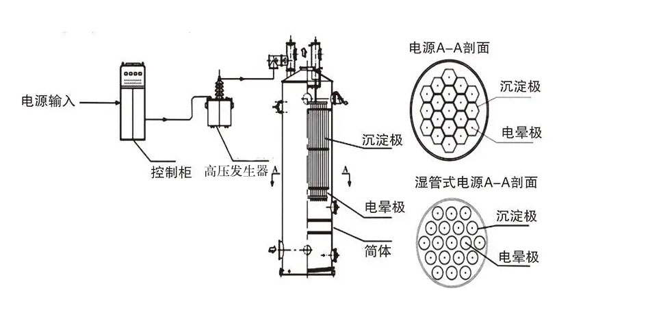 3.噴淋的水蒸氣在冷凝管壁形流動成帶電水膜,使纖維粉塵及油霧顆?;胙b置底部流出,從而避免了粉塵和油霧對電極和管壁的沾污。