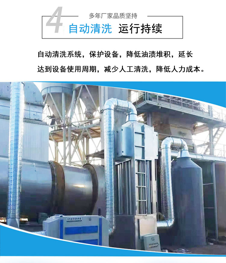 1.采用創新性的噴淋和多層高壓靜電場一體化混合設計,除塵、除油煙、降溫、滅火效果優異,沒有滴油、堵塞、燃燒的現象發生。