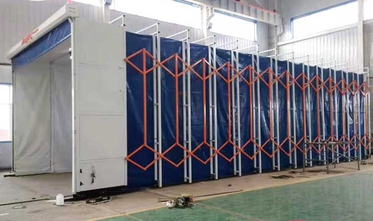 2.1、 伸縮移動噴漆房:是由框架主體、阻燃PVC布、防爆照明等形成的半封閉空間,和廢氣凈休設備一起形成涂裝作業的工作場合。