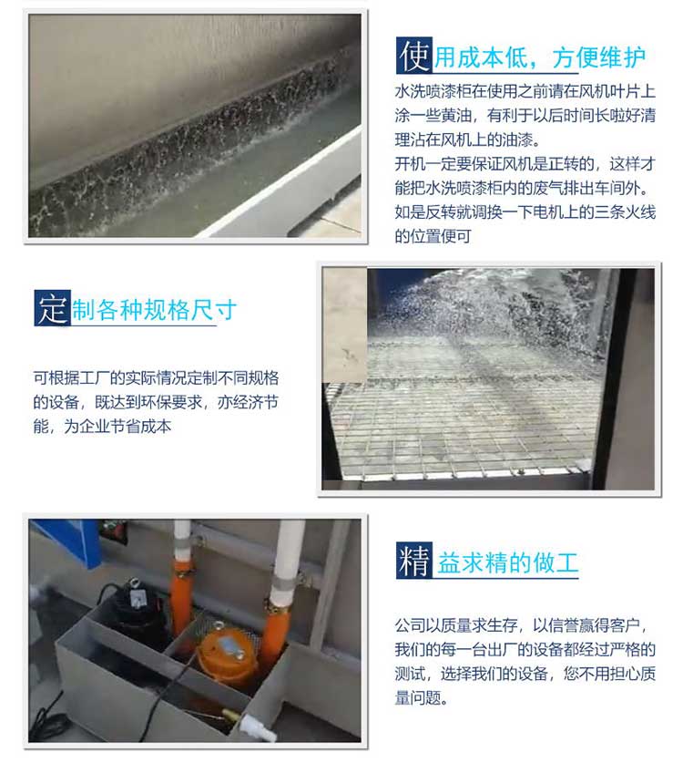 水簾柜是處理噴漆霧的一種廢氣處理設備。它的作業原理是將噴漆過程中噴槍噴出來的廢氣俗稱漆霧約束在必定的區域內進行過濾。再經過吸水泵循環將水箱內的水抽至上部水槽,由水槽溢流至水簾板,經過水簾板構成水簾  ,同時使用高速氣流所發生的沖擊效果,經旋流板將水卷起來使水霧化來洗刷空氣,凈化漆霧,經擋水板則將空氣中的水霧阻撓下來,處理后的空氣經過風機與排風管道排出車間外面,能夠使操作者在契合國家衛生條件和安全標準的作業環境中作業,然后促進企業出產功率更高。