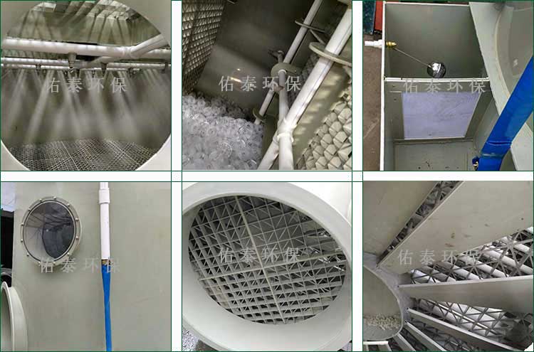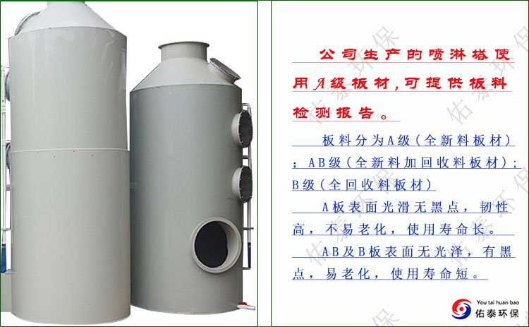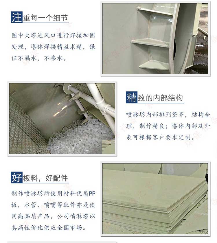 3、可根據要求定制1000至100000風量的噴淋塔;防腐蝕水泵、除霧層、清污口可根據要求添加。